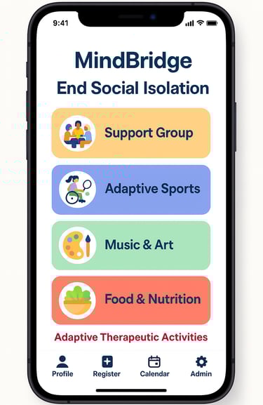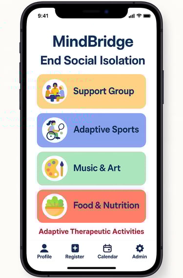 The Mind-Bridge app is a unified platform designed to reduce social isolation by connecting survivors and caregivers to adaptive therapeutic activities in their communities. Through an easy-to-use interface, users can explore programs like support groups, adaptive sports, food for healing, and art and music therapy. Mind-Bridge manages registration, scheduling, reminders, and community interaction, while also helping partner organizations track participation and outcomes. Built to support patients, caregivers, and communities, the Mind-Bridge app creates structure, connection, and belonging, right from your phone.